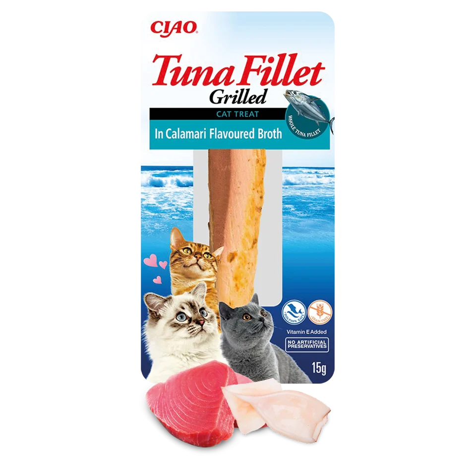 Inaba Cat Tuna Fillet In Calamari Broth to wysokiej jakości przysmak dla kotów, który łączy soczysty filet z tuńczyka z aromatycznym bulionem z kalmarów. Jest to naturalna przekąska, bogata w białko i o intensywnym smaku, idealna dla wymagających kotów.