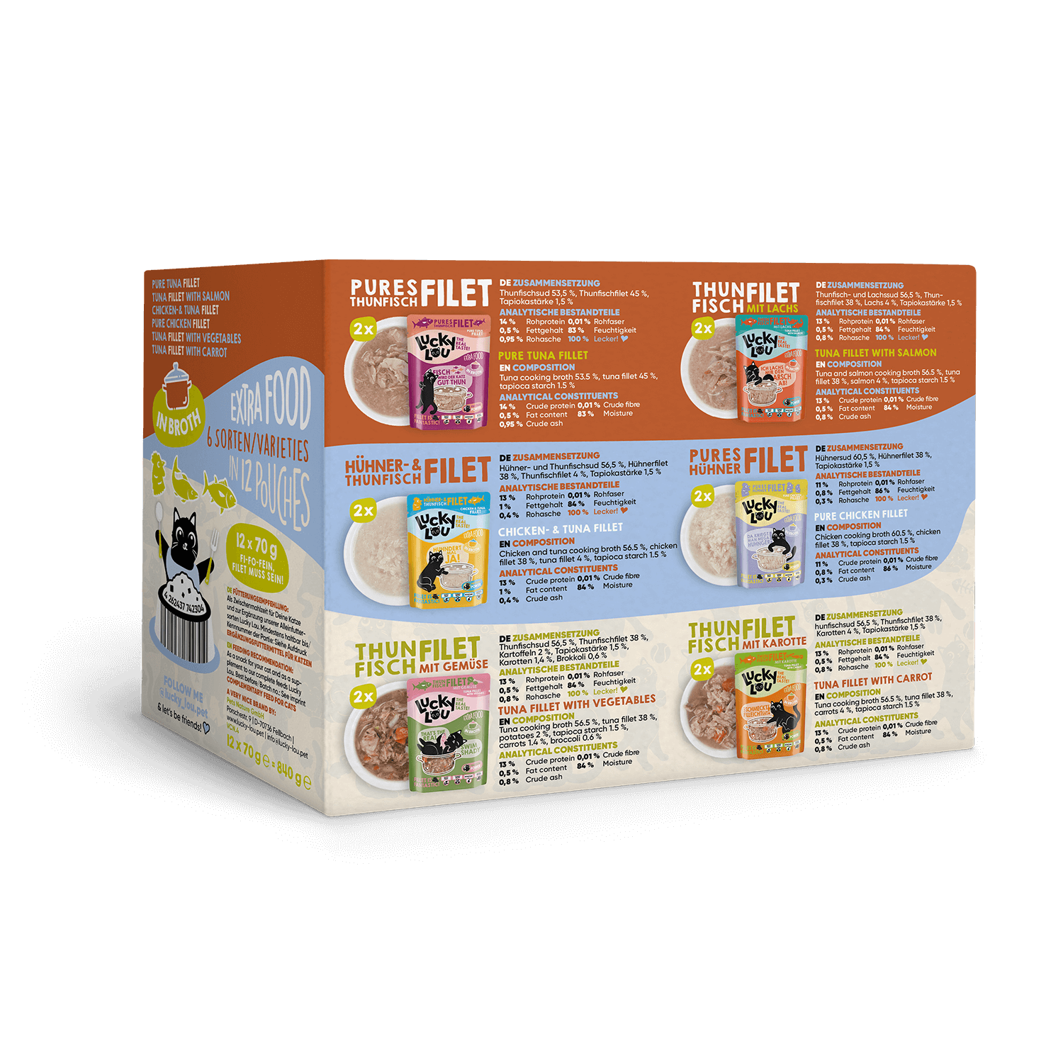 My, koty, uwielbiamy być rozpieszczane. Od czasu do czasu lubisz prawdziwą ucztę, prawda? Dokładnie tak samo jest z nami, kotami. Uwielbiamy dodatki! Dlatego do mojej linii karm mokrych dodałem Lucky Lou® Extra Food. Ty lubisz soul food, my koty kochamy soczyste filety. Przynajmniej ja tak czuję. A żeby było jeszcze pyszniej, można przygotować ją na dwa sposoby: w galarecie i w bulionie. Naprawdę pyszne, mówię wam!
