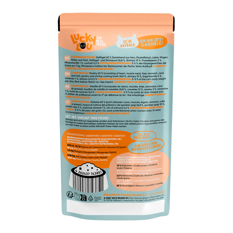 Lucky Lou Lifestage Adult Drób i Krewetki to wysokiej jakości mokra karma premium dla dorosłych kotów. Jej receptura opiera się na ponad 94% mięsa drobiowego, podrobów i bulionu, co zapewnia bogactwo białka i składników odżywczych. Dodatek krewetek wzbogaca smak i dostarcza cennych kwasów tłuszczowych omega-3. Karma zawiera również około 2% węglowodanów roślinnych, 1% składników mineralnych oraz niewielką ilość wysokiej jakości oleju. Produkt jest wolny od zbóż, glutenu, dodatku cukrów oraz GMO, co czyni go odpowiednim wyborem dla kotów z wrażliwym układem pokarmowym lub alergiami pokarmowymi.