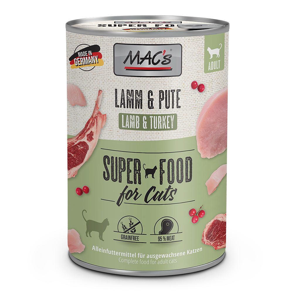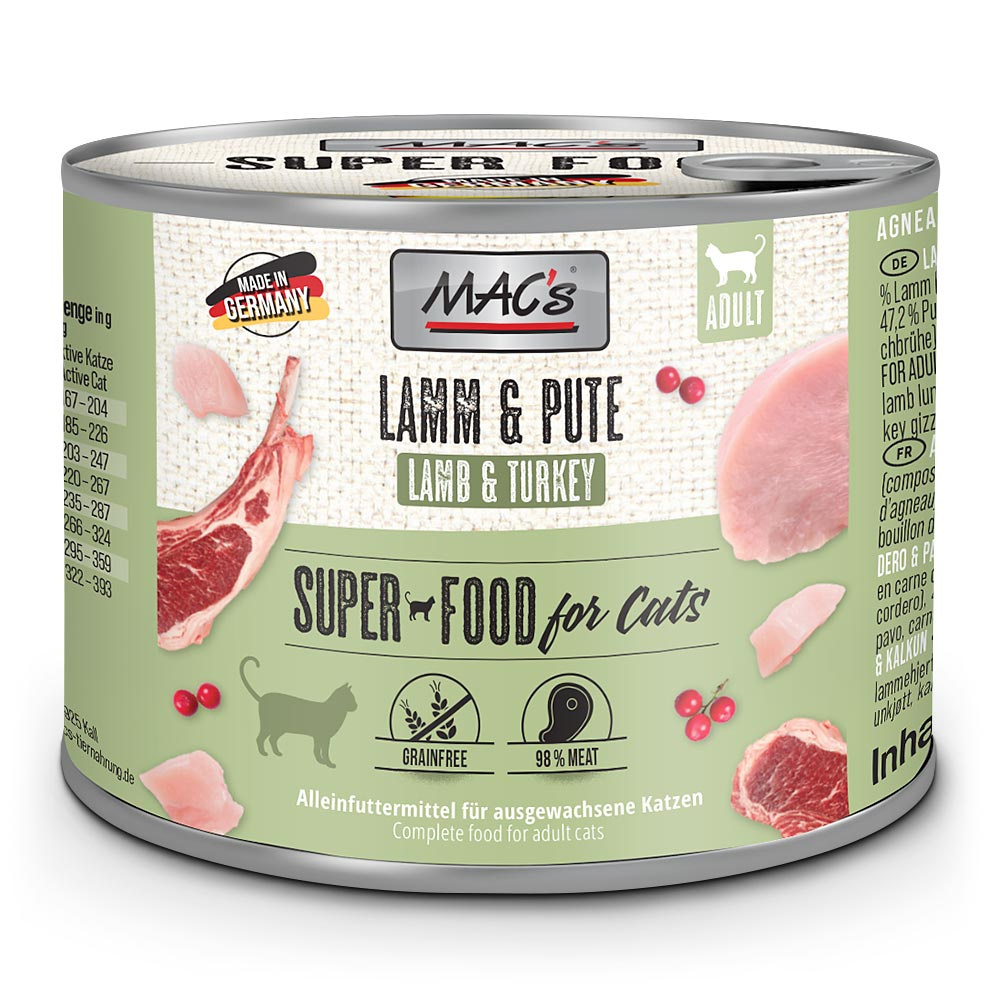 MAC's Cat - Jagnięcina i Indyk to mokra karma dla kotów, dostępna w opakowaniach 200 g oraz 400 g. Jest to pełnoporcjowa karma, która łączy dwa wysokiej jakości źródła białka: jagnięcinę i indyka, oferując kotom smaczny, lekkostrawny i zdrowy posiłek.