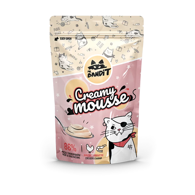 Mr. Bandit Creamy Mousse - Kurczak i krewetki to wyjątkowy, kremowy przysmak dla kota, który łączy smak delikatnego kurczaka z intensywnym aromatem krewetek. Ta aksamitna przekąska to idealny wybór dla kotów, które uwielbiają kombinację mięsnych i rybnych smaków w jednej porcji.