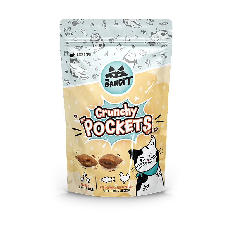Mr. Bandit Crunchy Pockets - Tuńczyk i Kurczak to smakowite, chrupiące kieszonki z miękkim nadzieniem, które łączą w sobie dwa uwielbiane przez koty smaki – delikatnego kurczaka i aromatycznego tuńczyka. Ta wyjątkowa przekąska to idealny sposób na rozpieszczanie kota, jednocześnie dostarczając mu wartościowych składników odżywczych.