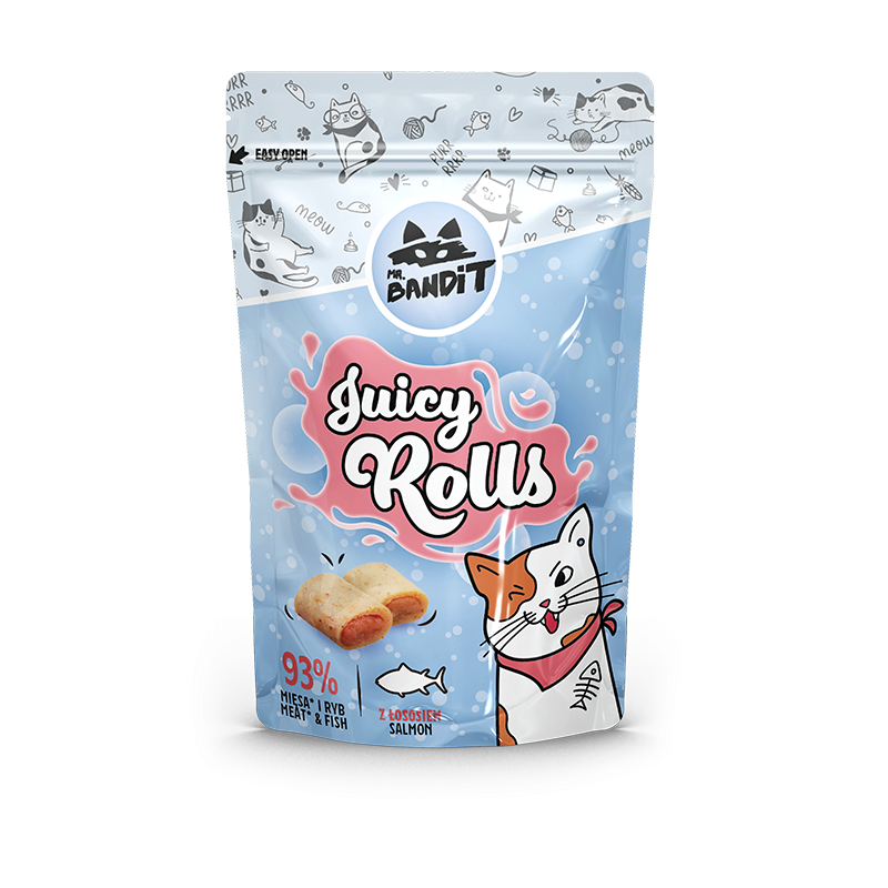 Mr. Bandit Juicy Rolls to wilgotne krokieciki ze smakowitym nadzieniem z łososia. Miękkie i aromatyczne kąski to świetna motywacja do figlowania dla kocich łobuzów!