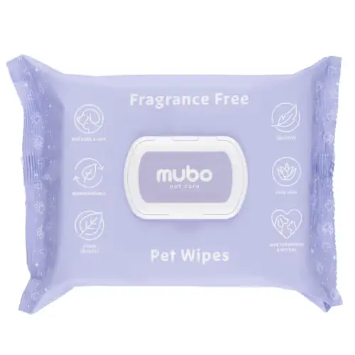 Wegańskie, delikatne chusteczki nawilżane dla psa i kota Mubo Fragrance Free Pet Wipes. Nasączone łagodnym płynem myjącym. To praktyczny sposób na codzienną pielęgnację skóry i sierści bez użycia wody. Odpowiednie do każdego rodzaju skóry, zwłaszcza wrażliwej i skłonnej do podrażnień, nie tylko skutecznie oczyszczają, ale również wspierają naturalną regenerację naskórka.
