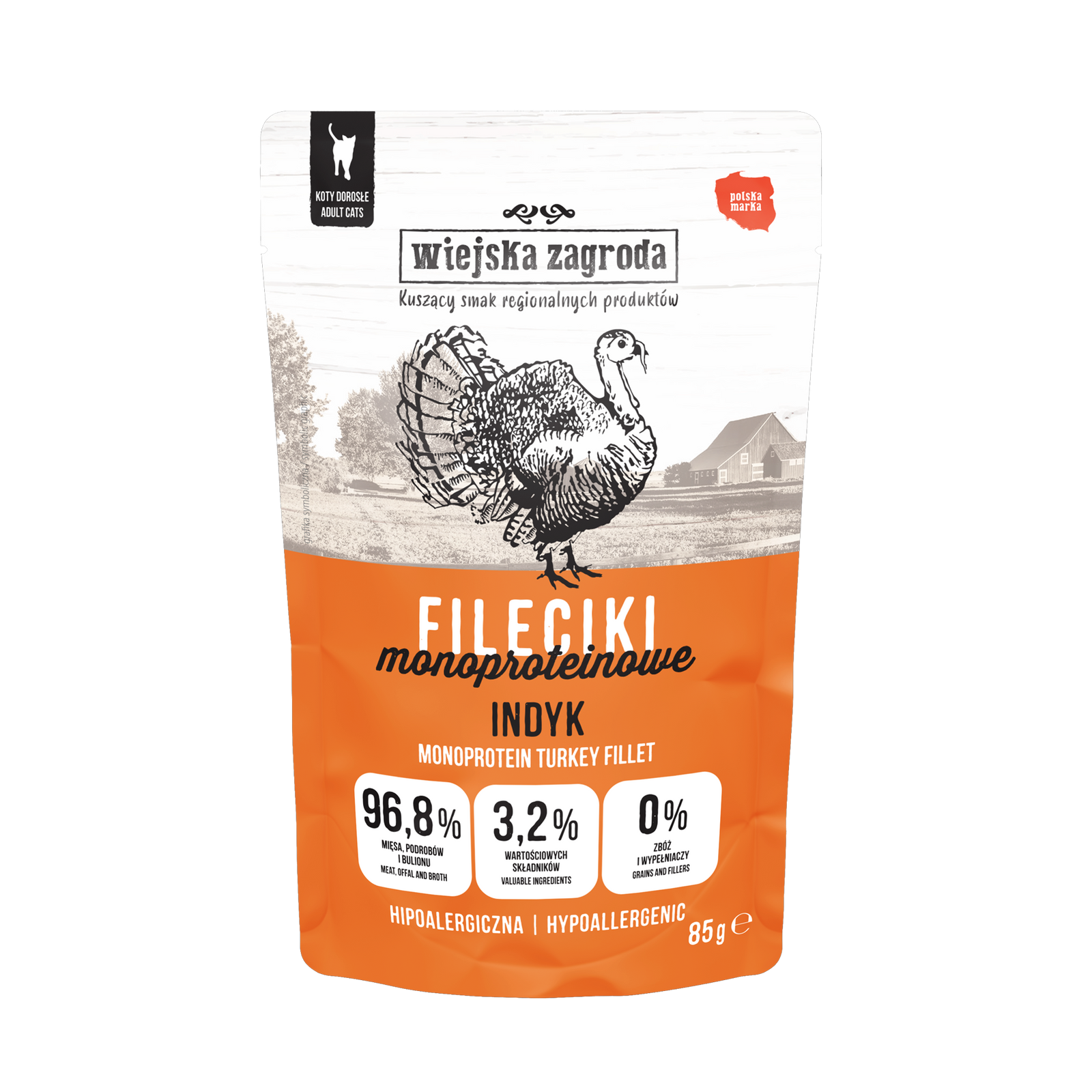 Szukasz naturalnej mokrej karmy dla kota w formie delikatnych, soczystych filecików zanurzonych w aromatycznym sosie? Monoproteinowe fileciki Wiejska Zagroda to idealny wybór! Każda saszetka zawiera starannie wyselekcjonowane kawałeczki mięsa indyka o doskonałej konsystencji, które są wyjątkowo apetyczne dla każdego kota. Dzięki aż 96,8% zawartości mięsa, podrobów oraz bulionu, bezzbożowej recepturze oraz hipoalergicznemu składowi, fileciki sprawdzą się nawet u kotów z delikatnym układem pokarmowym.