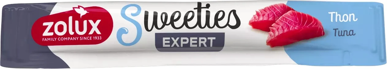 ZOLUX Sweeties to kremowy przysmak dla kotów, wyróżniający się intensywnym smakiem tuńczyka. Dostępny w praktycznej tubce o pojemności 14 g, idealnej do rozpieszczania pupila każdego dnia.